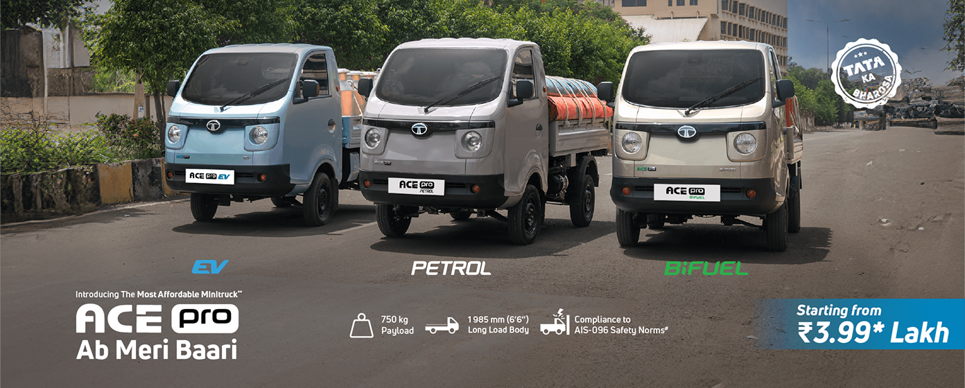 The trusted Tata Ace range has empowered 25 Lakhs + entrepreneurs while helping individuals achieve their success goals. One of India’s most desired Small Commercial Vehicles, the Tata Ace family offers variants across Diesel, Petrol, CNG, Bi-fuel (CNG + Petrol) & EV fuel options that suit different business needs. The Tata Ace family is specially designed to provide superior mileage, enhanced profits through increased productivity, and lower operational costs for more savings. Ensuring total peace of mind, the Tata Ace models offer a 2 year /72000 km warranty. Experience success with the power of Tata Ace.